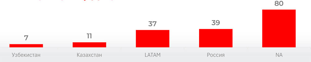 Отношение числа стоек в коммерческих ЦОДах к объему ВВП в разных странах и регионах, шт./$млрд